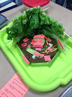 Today in Science 10 we began investigating how other "things" besides energy flow through an ecosystem. To learn about biomagnification, we became a new organism---a grasshopper, a shrew, or a hawk, and simulated a food chain. The grasshoppers fed on the corn fields (pipe cleaner pieces), the shrews fed on the grasshoppers, and the hawks fed on the shrews. Unknowingly the white pipe cleaner pieces were sprayed with a pesticide. The pesticide moved through the food chain becoming concentrated in the top consumer. Here are some pictures of our Deadly Links Game.